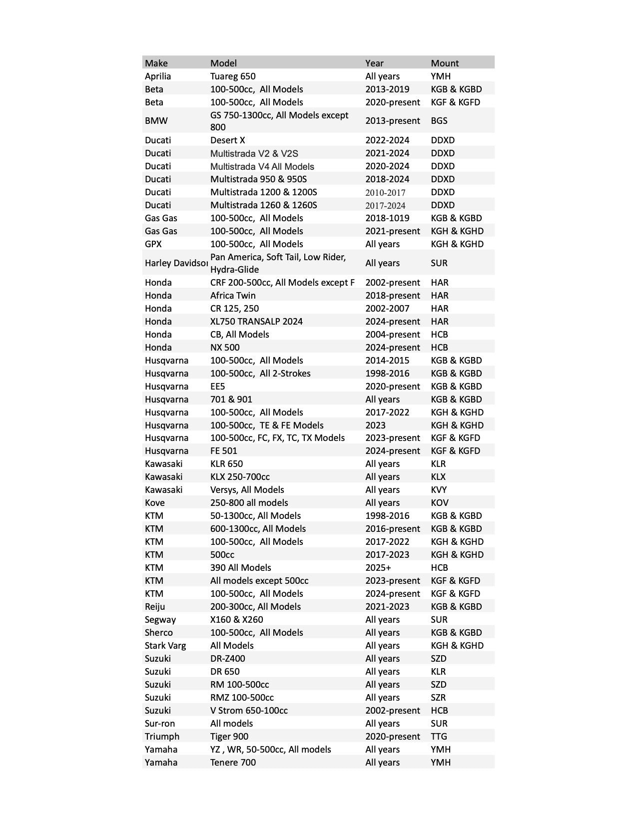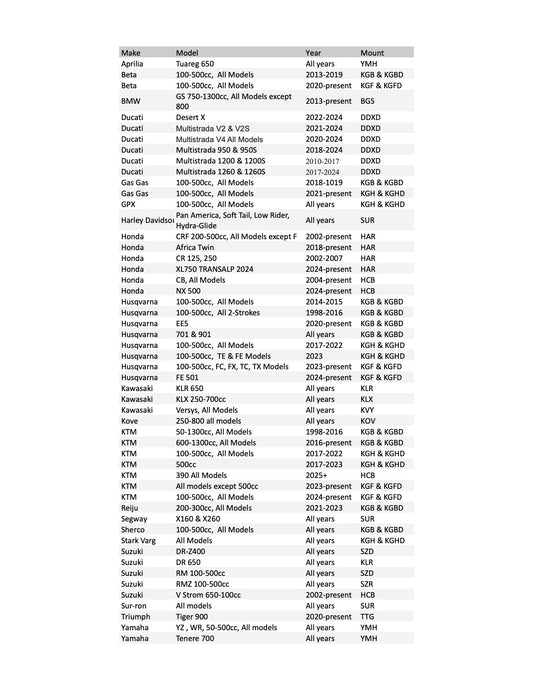 Finding your Footpeg Model is easy. Use the chart below to find the Mount #. Then use the search function at the top right of the page to enter in the 3-4 letter Mount #. Mount #'s with the letter "D" at the end stand for Drop Mount. Please scroll past the chart below to see the product catalog options. Please email us if you have any questions regarding fitment. *PLEASE GO TO OUR DEALER PAGE AND ORDER WITH OUR CANADIAN OR EU LINKS TO SAVE ON DUTIES AND TARRIFS.*
