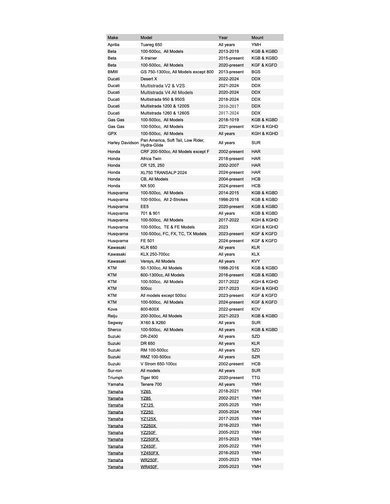 Finding your Footpeg Model is easy. Use the chart below to find the Mount #. Then use the search function at the top right of the page to enter in the 3-4 letter Mount #. Mount #'s with the letter "D" at the end stand for Drop Mount. Please scroll past the chart below to see the product catalog options. Please email us if you have any questions regarding fitment. *PLEASE GO TO OUR DEALER PAGE AND ORDER WITH OUR CANADIAN OR EU LINKS TO SAVE ON DUTIES AND TARRIFS.*